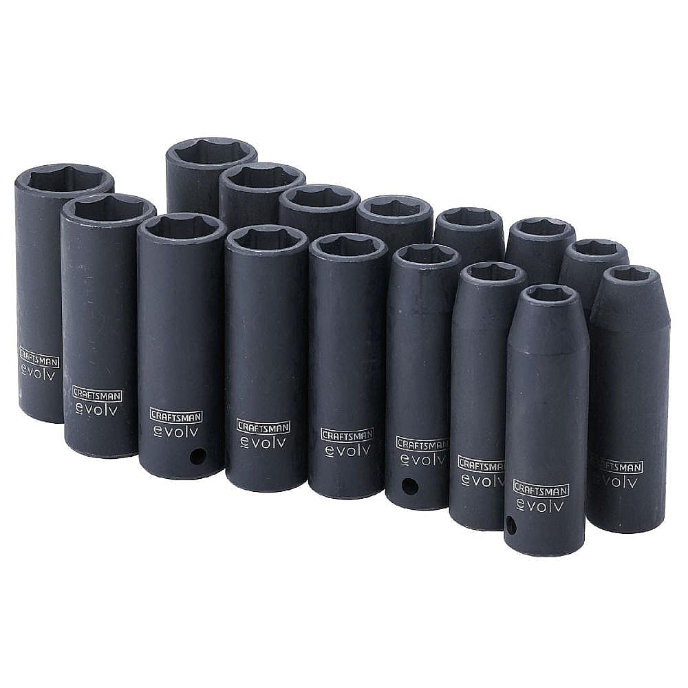 The Craftsman Evolv 16-piece1/2-in drive deep impact socket set (part number 16860SP) includes 8 standard and 8 metric deep impact sockets made of solid steel to resist fading, chipping and corroding. Craftsman impact socket set 16860SP includes the following socket sizes:Inch: 7/16, 1/2, 9/16, 5/8, 11/16, 3/4, 13/16 and 7/8Millimeter: 10, 12, 13, 14, 15, 17, 19 and 21 Price: 69.99 |