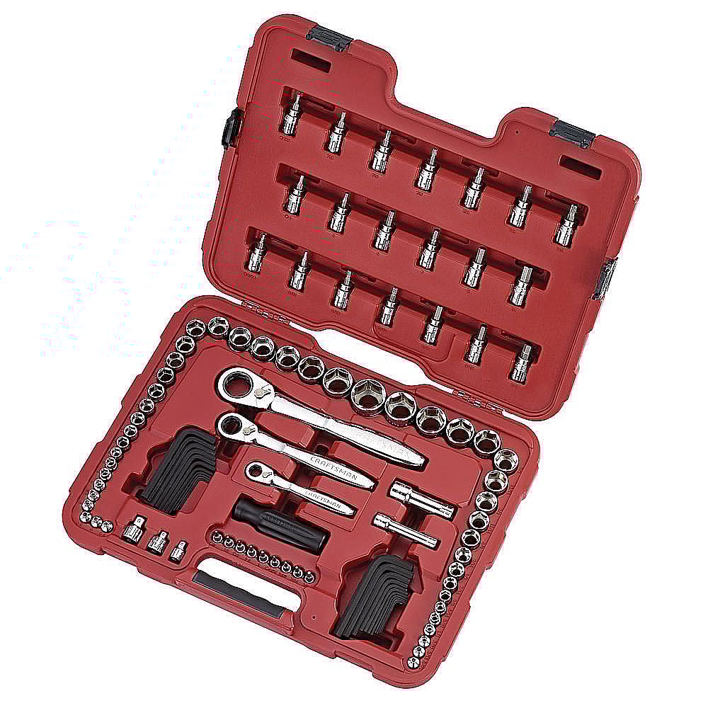 The Craftsman 104-piece Max Axess mechanic's tool set (part number 55104SP) with case comes with 36 sockets, 22 hex keys, 3 quick-release ratchets and more. It includes some of the most common drive sizes1/4, 3/8 and 1/2 inchesas well as metric. The extension bars improve access. The tools in Craftsman 104-piece tool set 40131 are made of durable alloy steel. Price: 149.99 |
