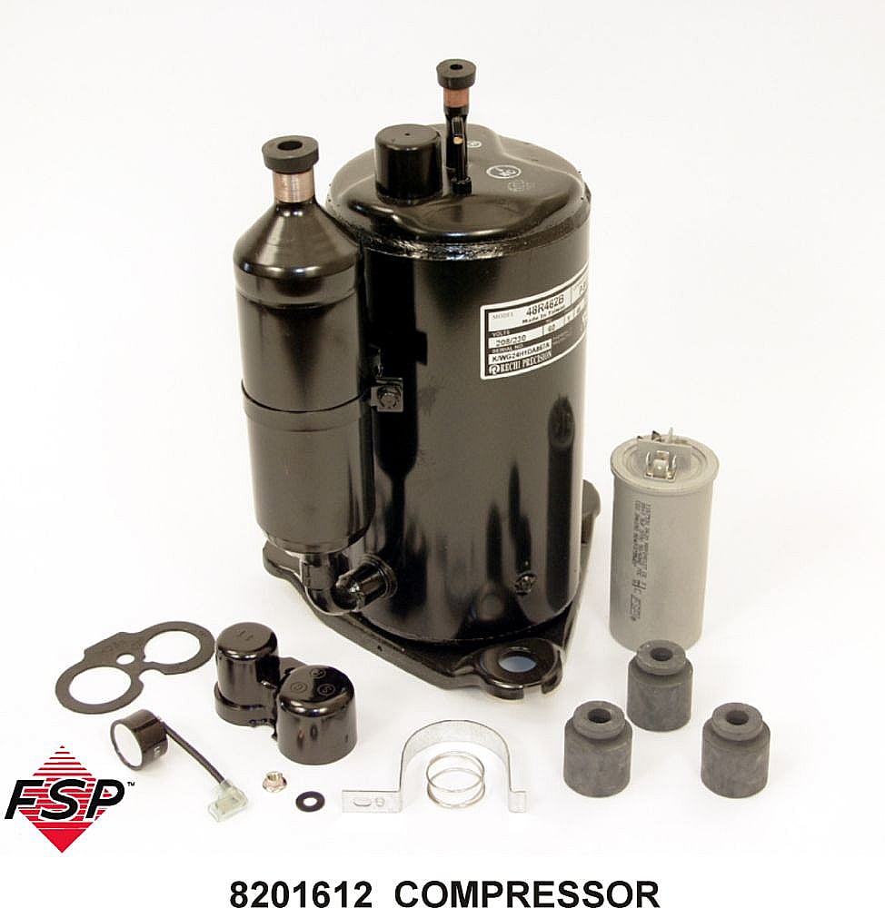 This manufacturer-approved compressor (part number 8201612) is for room air conditioners.Compressor 8201612 is a positive displacement pump that compresses the refrigerant in the sealed system of the room air conditioner.A service technician should do this repair because it involves recovering and recharging refrigerant in the sealed refrigerant system. Price: 328.37 |